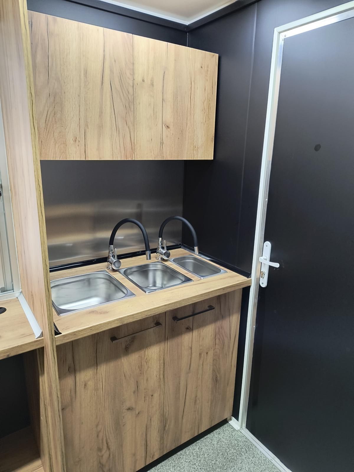 mit Waschbecken, Wasserhähne, Boiler, Pumpe und zwei Fässer